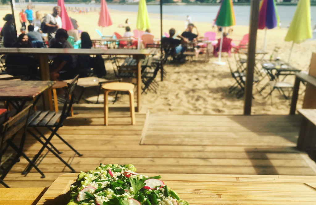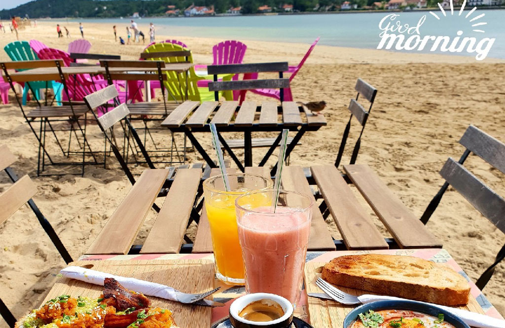 Frühstück, Brunch, Smoothie Bowl und Salat – Wunderschöne Sonnenterrasse mit Blick auf den See von Hossegor.