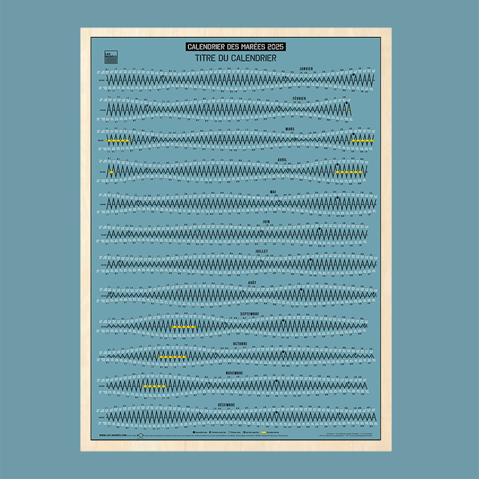 Descubra nuestro superventas: el calendario de mareas de 50 x 70 cm o 60 x 80 cm. Impreso en papel o directamente sobre madera.